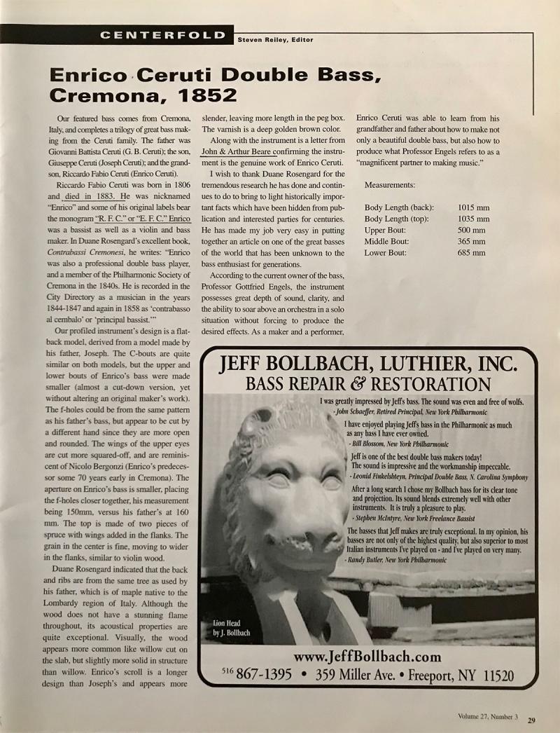 Kullanmakta olduğum harika enstrümanım İtalya’nın Cremona kentinden geliyor ve Ceruti ailesinin muhteşem kontrbas yapımı geleneğinin üçüncü neslini temsil ediyor. Baba Giovanni Battista Ceruti (G. B. Ceruti), oğul Giuseppe Ceruti (Joseph Ceruti) ve torun Riccardo Fabio Ceruti (Enrico Ceruti).
